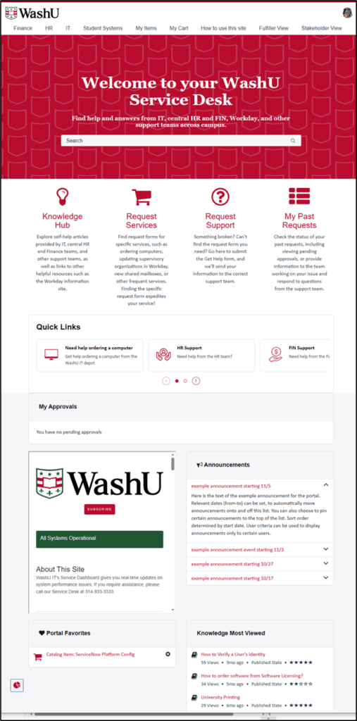 - Widgets for System Status, Announcements, Portal Favorites, and Knowledge Most Viewed will appear at the bottom.