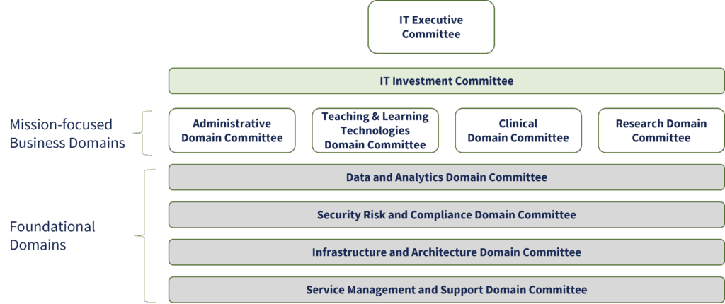 The Domain Committees are responsible for developing domain strategies, including service portfolios and project prioritizations, that align with the overall university strategy and priorities established by the IT Executive Committee.