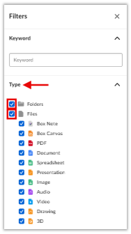 - After logging in to Box, select the filters icon in the search bar near the top of the window.